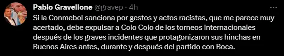 “Si la Conmebol sanciona por gestos y actos racistas, que me parece muy acertado, debe expulsar a Colo Colo de los torneos internacionales después de los graves incidentes que protagonizaron sus hinchas en Buenos Aires antes, durante y después del partido con Boca”, dijo Gravellone.