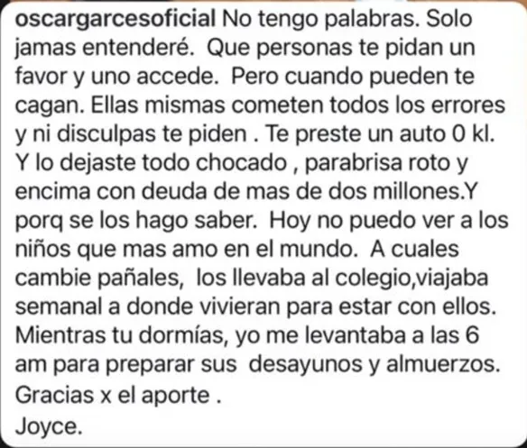 El ex Protagonista de la Fama señaló en sus redes que su cuñada no lo dejaba ver a sus sobrinos. “Les cambié pañales, los llevaba al colegio, viajaba semanalmente a donde vivieran para estar con ellos. Mientras tú dormías, yo me levantaba a las 6 am para preparar sus desayunos y almuerzos. Gracias por el aporte, Joyce”.
