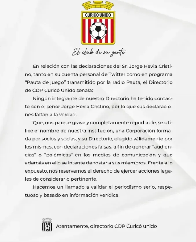 La respuesta de Curicó Unido fue en una declaración pública con la que descartó tajantemente la afirmación de Jorge Hevia Cristino. En el debut de Fiamengo jugó de lateral derecho, cometió un penal muy evidente y fue reemplazado en los 86′, cuando le dejó su lugar a Joaquín González.