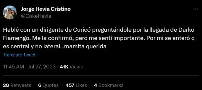 A raíz de eso, hubo un tuit que no gustó mucho en la dirigencia del cuadro curicano. “Hablé con un dirigente de Curicó por la llegada de Darko Fiamengo. Me la confirmó… pero me sentí importante. Por mí se enteró que es central y no lateral, mamita querida”, escribió el periodista de la radio Pauta.