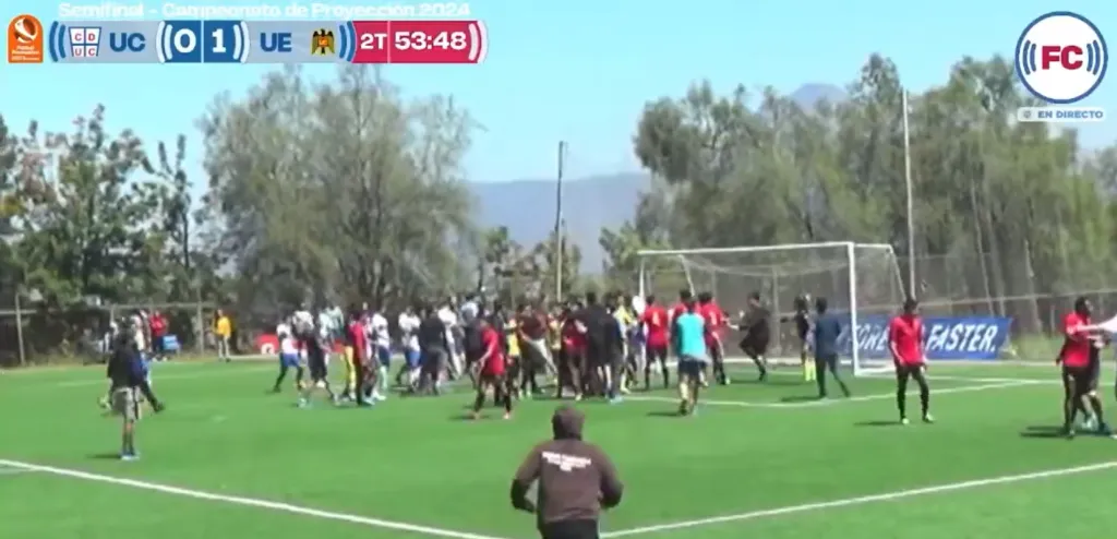 Se jugaba el minuto 54 del complemento cuando se dio un situación inusual en el campo de juego: un enfrentamiento de ambos equipos. A golpes. Un escenario en el que incluso algunos apoderados tomaron parte. “Se vienen las patadas y los combos”, describió el relator de Frecuencia Cruzada, Mario Palominos.