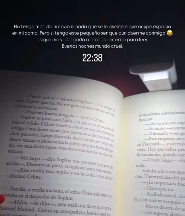 Agregando que “Así que me vi obligada a tirar de linterna para leer. Buenas noches, mundo cruel”.