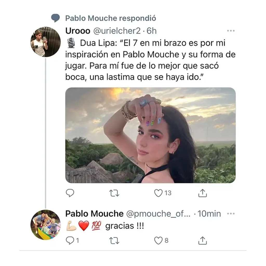 El usuario Urielcher2 publicó una frase (falsa) que le endilgaba a la artista británica. Según él, uno de sus tatuajes era por el jugador. “El 7 en mi brazo es por mi inspiración en Pablo Mouche y su forma de jugar. Para mí, fue de lo mejor que sacó Boca, una lástima que se haya ido”, escribió el tuitero.