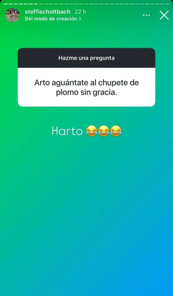 En la misma línea, un usuario le señaló su opinión sobre la relación. “Solo decir que siempre me preguntaba como no le molesta a ella (Steffi) que su pareja coquetee en vivo con otra”, a lo que ella respondió directamente escribiendo: “Molesta harto”.