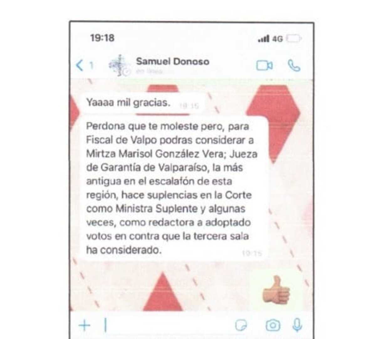 El sitio mencionado expuso una captura que probaría la cercanía del conocido penalista Samuel Donoso con Vivanco. Por WhatsApp, el abogado le habría solicitado favorecer a una jueza de Valparaíso para llegar a la Corte de Apelaciones, aunque el nombramiento nunca se materializó.
