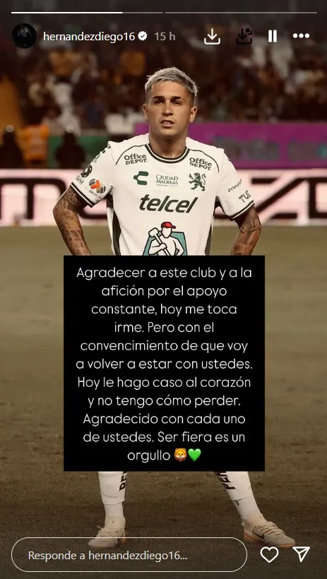 El jugador, que puede jugar por todo el frente de ataque, incluso aprovechó sus redes sociales para despedirse de la ‘fiera’, señalando “Agradecer a este club y a la afición por el apoyo constante. Hoy toca irme, pero con el convencimiento que voy a volver a estar con ustedes. Hoy le hago caso al corazón y no tengo como perder (…) Ser fiera es un orgullo”.