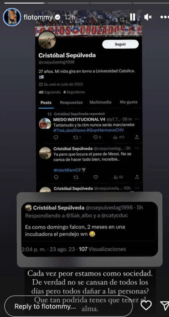 Una situación que, como era de esperar, no le hizo para nada gracia a Florencia Pouso, esposa de Peluca, quien compartió una historia con el criticado comentario, lanzando munición de grueso calibre en contra el hincha de la UC.