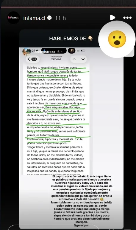 Mientras que cierra el mensaje señalando: “Lamentablemente, no entiendes que es tu hija quien sufre las consecuencias, soy lo bastante independiente y a mi hija jamás le faltará nada gracias a su madre. Sigue siendo el hombre tan básico y poco hombre que eres, me aburriste Guillermo Maripán”.