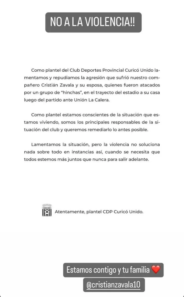 De forma inmediata los compañeros de Zavala en Curicó Unido sacaron un comunicado de prensa respaldando a su compañero.
