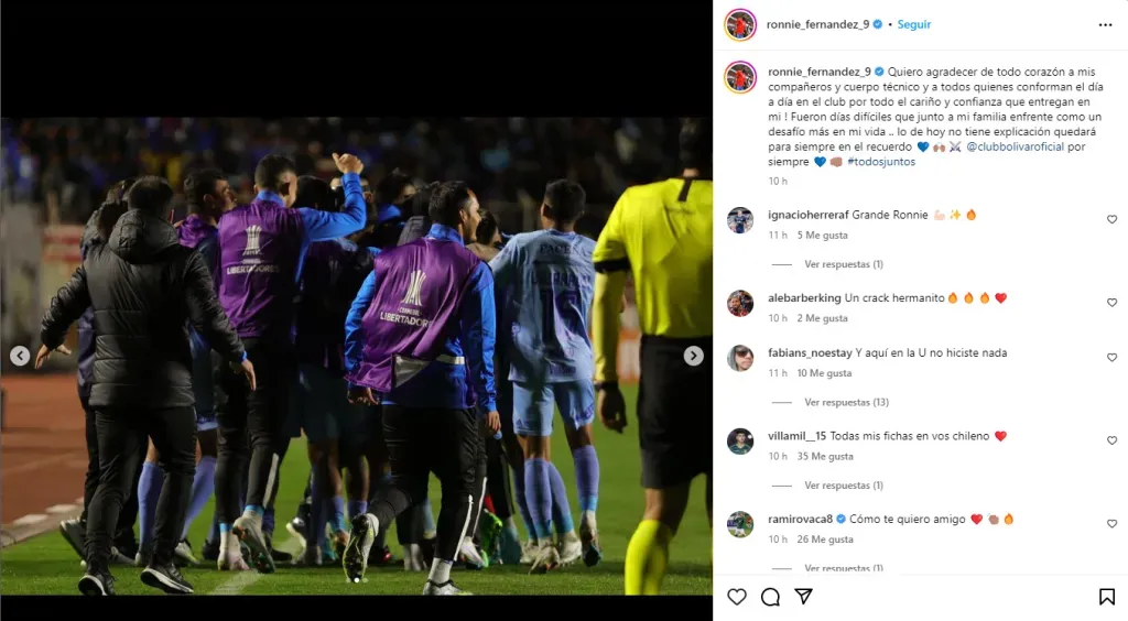 “Lo de hoy no tiene explicación quedará para siempre en el recuerdo”, escribió el atacante formado en Santiago Wanderers. Una muestra inequívoca de que el tanto que anotó en el Hernando Siles no se borrará de su memoria.