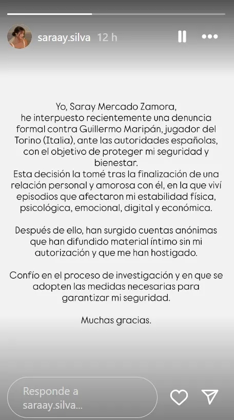 En sus historias de Instagram, la joven escribió. “He interpuesto recientemente una denuncia formal contra Guillermo Maripán, jugador del Torino (Italia), ante las autoridades españolas, con el objetivo de proteger mi seguridad y bienestar”.
