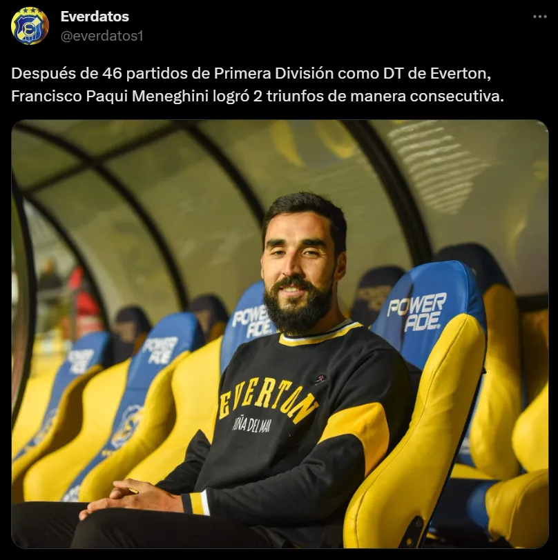 Pasó casi un año y medio para que Everton pudiera encadenar un par de victorias en el Campeonato Nacional de la mano de Francisco Meneghini, según reportó la cuenta de Twitter @EverDatos. El DT de 34 años tomó el mando del plantel profesional en enero del año pasado. Y con ese triunfo ante la complicada Franja, el elenco viñamarino quedó en el 5° lugar de la tabla de posiciones.