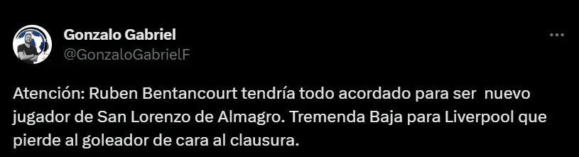 Aunque todo parece indicar que es Cristián Tarragona el preferido del DT Rubén Insúa, desde Uruguay afirman que las negociaciones entre Bentancourt y CASLA avanzaron mucho. “Liverpool pierde al goleador de cara al Clausura”, informó el periodista Gonzalo Gabriel. Aunque la transferencia podría costar unos 600 mil dólares. O al menos esa es la pretensión de la dirigencia del cuadro montevideano.