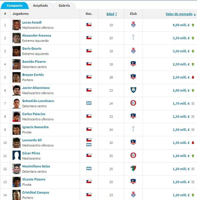 Sin embargo, según el último informe sobre valor de mercado de futbolistas, entregado por el sitio especializado Transfermarkt, Pizarro no aparece en el podio de los jugadores más caros del fútbol chileno, a diferencia de Osorio y Assadi.