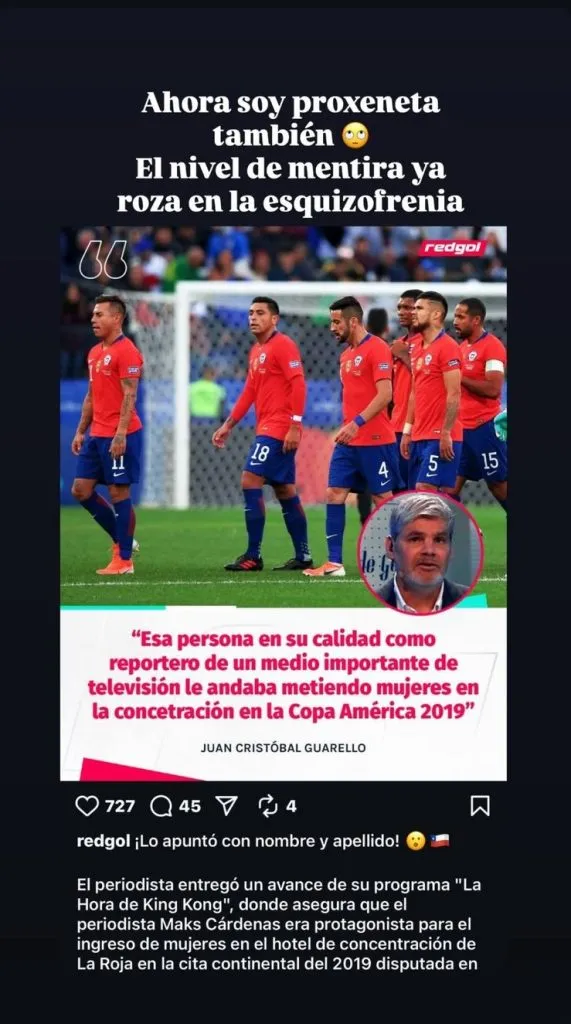 Pero después replicó una placa en las redes de Redgol, donde se citó la frase de Guarello y su denuncia, para dejar en claro la molestia que tiene con el tema que lo relaciona.