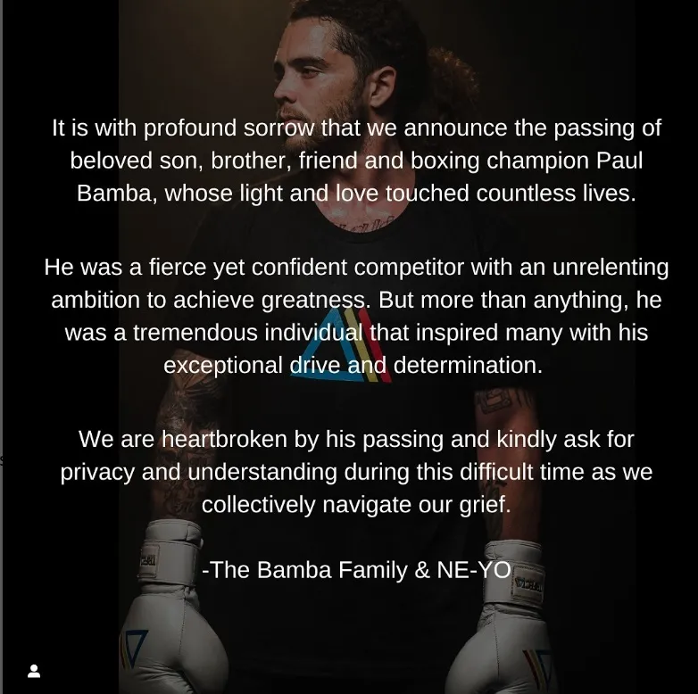 “Es con profundo pesar que anunciamos el fallecimiento del amado hijo, hermano, amigo y campeón de boxeo Paul Bamba, cuya luz y amor tocaron innumerables vidas”, se lee en el comunicado.