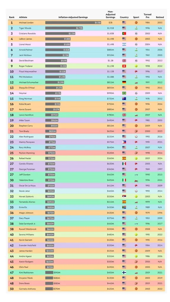 En abril de este año el sitio Sportico publicó una actualización del ranking que mostraba a los 50 deportistas mejores pagados de la historia.