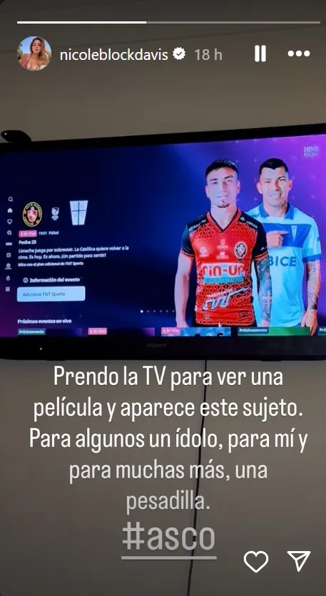 La actriz y ex participante de Tierra Brava compartió una historia en su cuenta de Instagram en donde aparece Medel y escribió: “Prendo la TV para ver una película y aparece este sujeto. Para algunos un ídolo, para mí y para muchas más, una pesadilla”.
