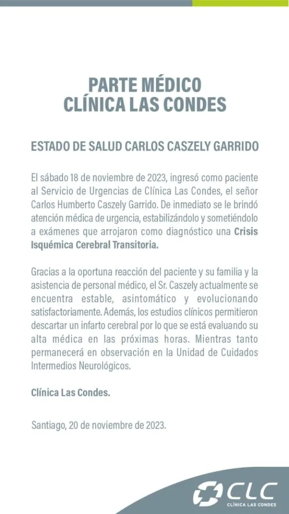 “El sábado 18 de noviembre de 2023, ingresó como paciente al Servicio de Urgencias de Clínica Las Condes, el señor Carlos Humberto Caszely Garrido”, comenzaron explicando.