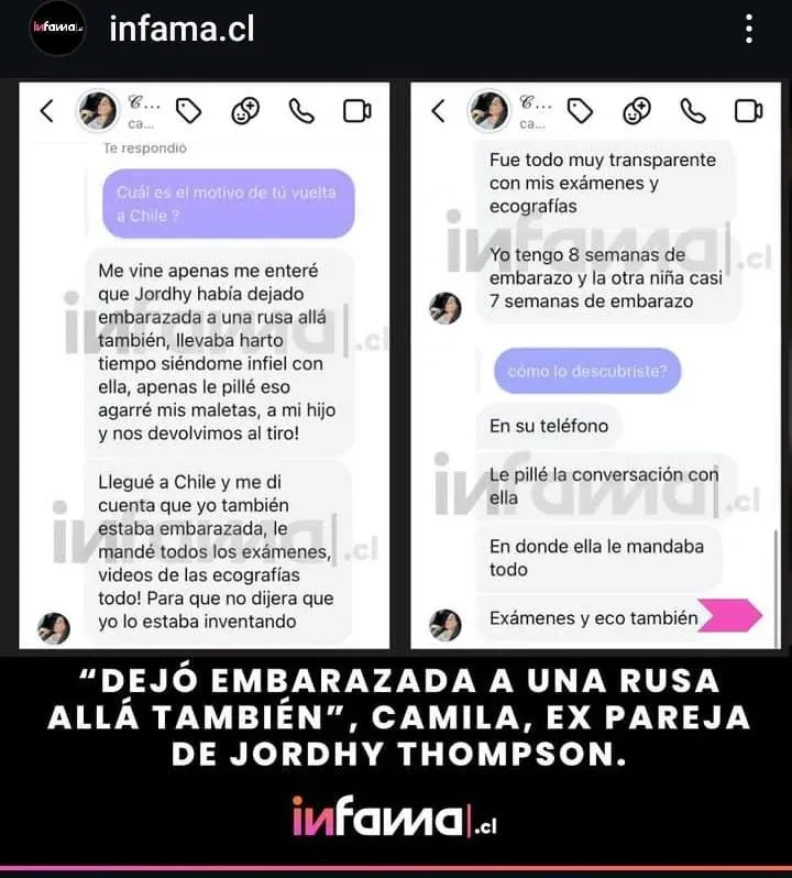 Asimismo, señala que su regreso a Chile se debe a que descubrió una infidelidad del jugador de FC Orenburg. “Me vine apenas de me enteré de que Jordhy había dejado embarazada a una rusa allá. Llevaba harto tiempo siéndome infiel con ella. Apenas pillé eso, agarré mis maletas, mi hijo y nos devolvimos al tiro”.