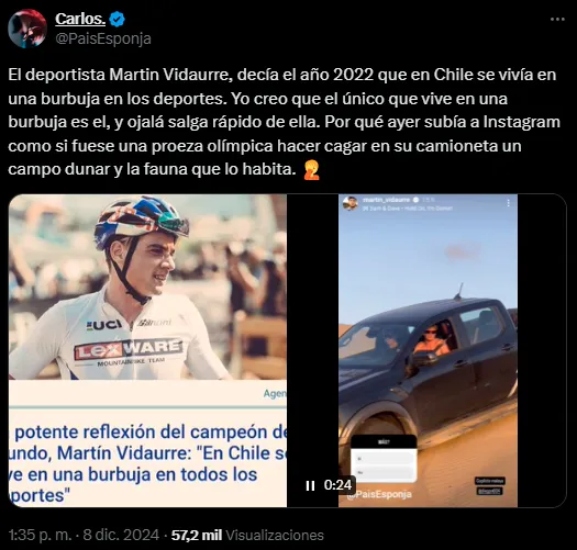 Algunos usuarios lo tildaron de “cuico” comentando lo siguiente: “Se me cayó Martín Vidaurre. ¿Cuál es la necesidad de seguir metiendo camionetas en dunas e interferir con la naturaleza? Bueh, francamente, que más se le va a pedir a un cuico”.