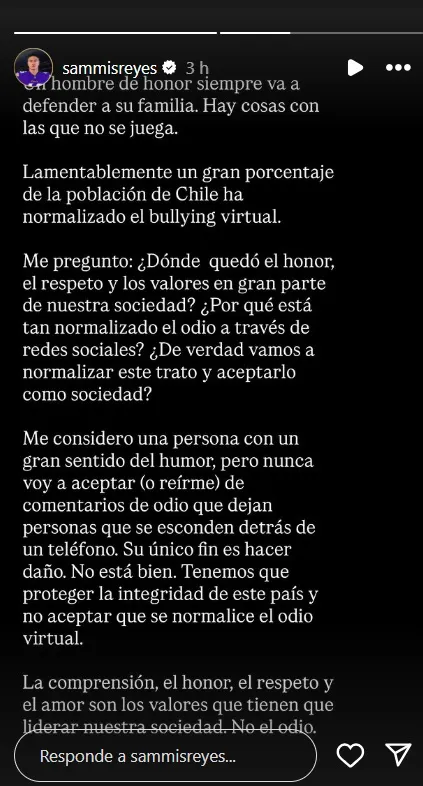 Asimismo, a través de sus redes sociales Sammis continuó con sus descargos. “Un hombre de honor siempre va a defender a su familia. Hay cosas con las que no se juega. Lamentablemente, un gran porcentaje de la población de Chile ha normalizado el bullying virtual”.