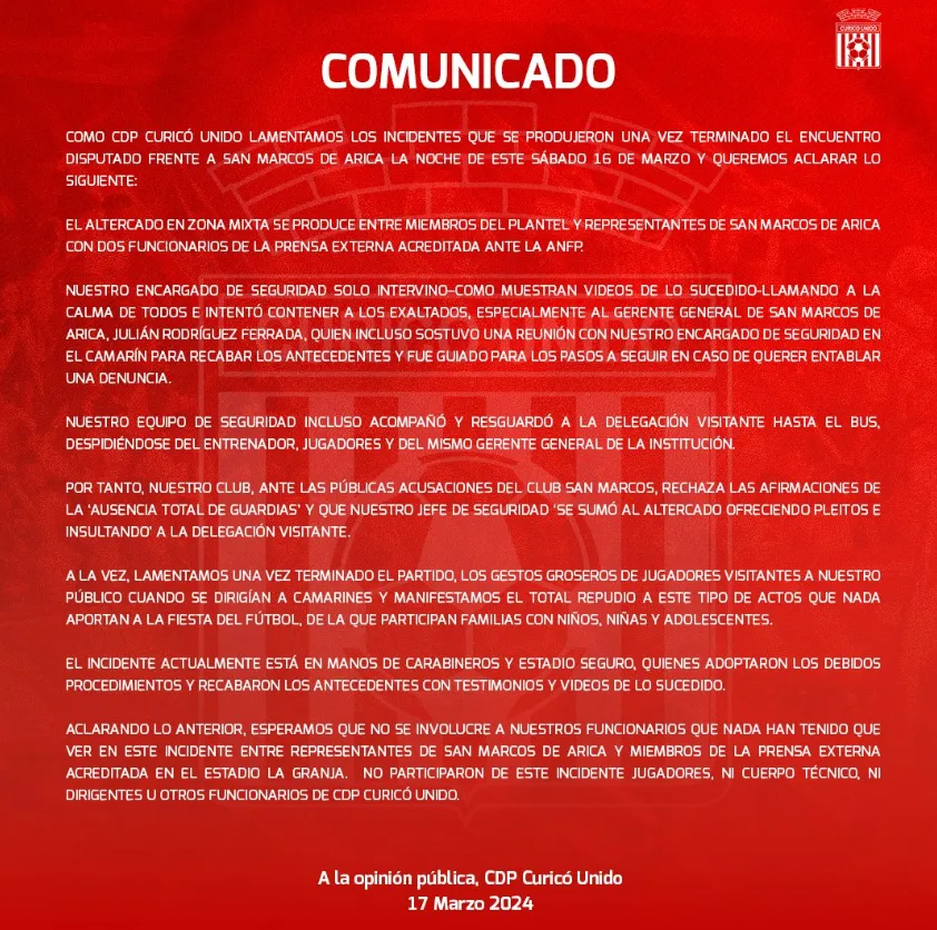 “A su vez, queremos destacar la ausencia total de guardias en los vestuarios luego del partido. De esto se percató el jefe de seguridad de Curicó Unido, quien ofreció pleitos e insultó a nuestra delegación en presencia de todos. Nos encontramos consternados por este comportamiento inaceptable”, afirmó San Marcos de Arica.