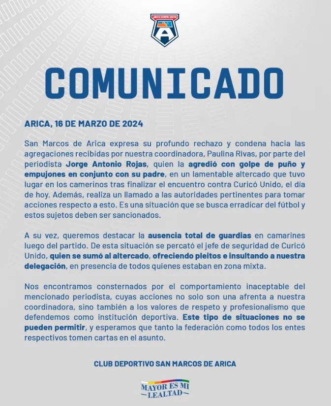 Todo esto, por supuesto, fue reprochado por la institución ariqueña. “El periodista Jorge Antonio Rojas la agredió (a Paulina Rivas) con un golpe de puño y empujones en conjunto con su padre. Fue un lamentable altercado que tuvo lugar en los camarines”, reza el comunicado que difundió el Santo en sus canales oficiales.