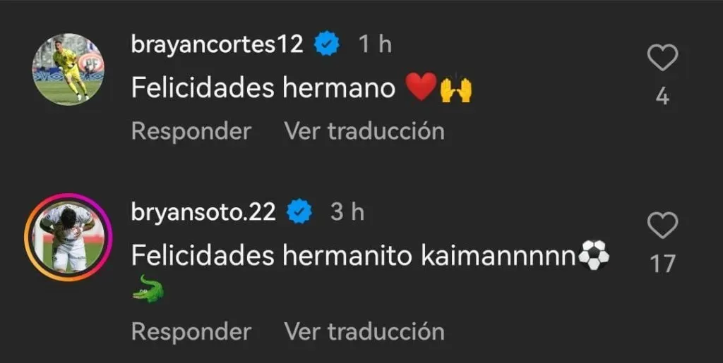 Y recibió varias felicitaciones provenientes de Colo Colo. O que tenían que ver con recuerdos de su paso por los albos. Brayan Cortés, el arquero del Cacique, fue uno de los que le dedicó palabras. “Felicidades, hermano”, le posteó el Indio en Instagram. Bryan Soto, mediocampista que milita cedido en Everton de Viña del Mar, reveló un apodo.
