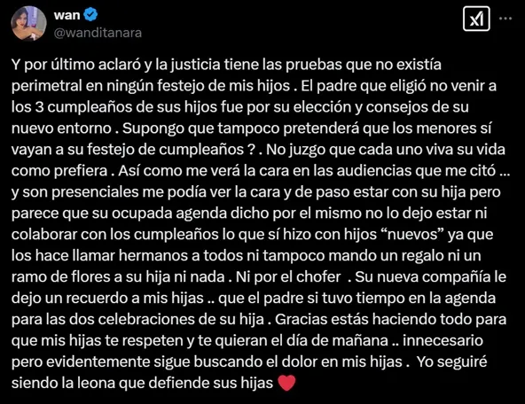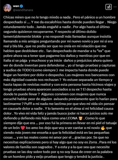 A través de su cuenta de X (Ex Twitter) Wanda escribió: “Chicas miren que no le tengo miedo a nada, pero el pánico a un hombre despechado si y me da escalofríos hasta donde pueden llegar. Niego rotundamente todo. Jamás engañé a nadie”.