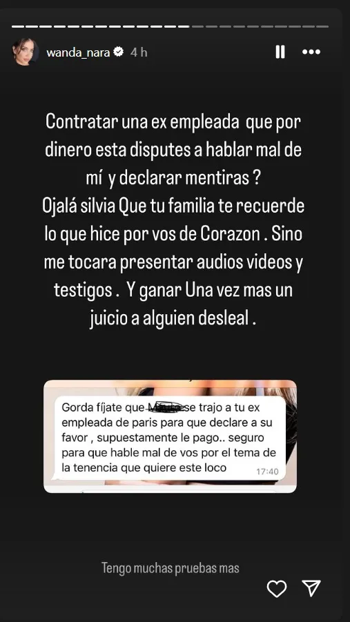 En la publicación, Wanda expone que le enviaron un mensaje que dice: “Gorda, fíjate que Mauro se trajo a tu ex empleada de París para que declare a su favor, supuestamente le pagó. Seguro para que hable mal de vos por el tema de la tenencia que quiere este loco”.