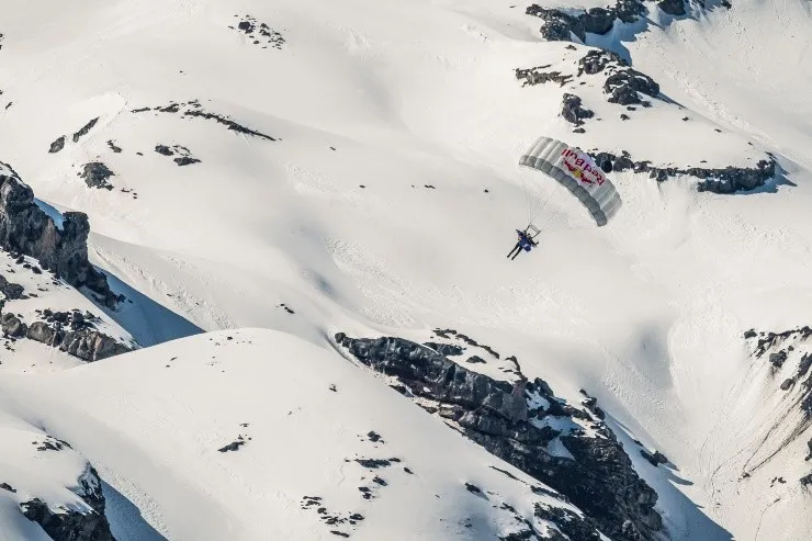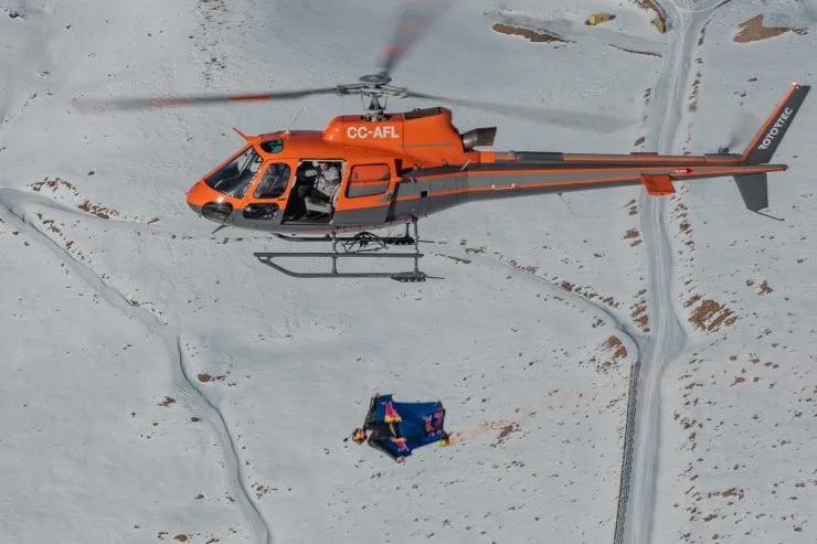 La idea era pasar por medio de los edificios del centro de esquí en un espacio no mayor a los 4 metros de ancho que los separan, por lo que no había lugar a fallos de cálculo. Por eso, Sebastián abordó un helicóptero y llegó a los 3 mil metros de altura para lograr el cometido.