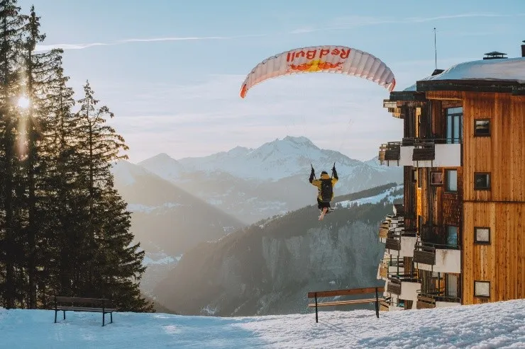 Con los esquís puestos y la vela preparada, Valentin Delluc, uno de los mejores speed riders del mundo (disciplina que combina en simultáneo el ski fuera de pista y el parapente), realizó una serie de sorprendentes trucos aéreos en la desértica estación de ski de Avoriaz, en Los Alpes.