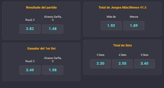 El OSO de Coolbet te cuenta que el favorito para ganar en esta gran final del US Open 2022 esCarlos Alcaraz, que paga 1,48 veces lo que juegues en este último encuentro. En cambio, si piensas que seráCasper Ruud el vencedor y, además, el nuevo número uno del mundo, paga 2,82 veces lo que apuestes. Además, puedes ver las otras categorías para hacer una apuesta combinada, como quién será el ganador del primer set o el total de sets que se jugarán esta tarde.