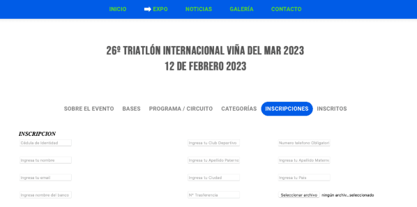 Si quieres inscribirte al Triatlón Internacional de Viña del Mar 2023 debehacerlo de manera online a través de su página web, donde deberás entrar a Inscripcionesy, una vez ahí, llenar el formulario de inscripción.