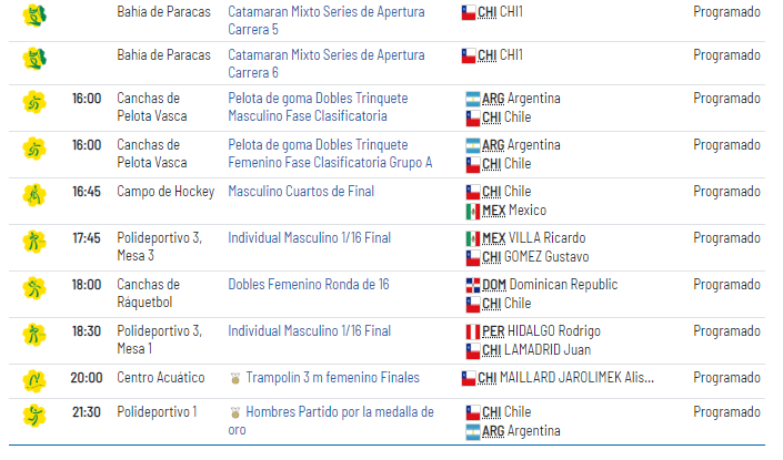 Una de ellas se puede dar durante la jornada de este lunes, cuando el balonmano masculino juegue la final ante Argentina a las 21:30 hrs. Antes, Allison Maillardse jugará chances doradas en trampolín 3 metros femenino.