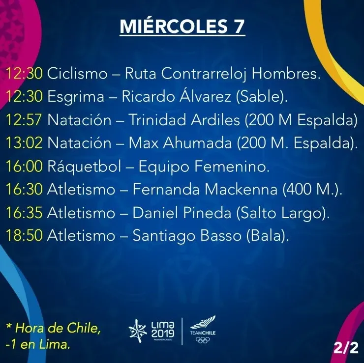 Esta es la programación oficial de la jornada de miércoles 7 de agosto del Team Chile en los Juegos Panamericanos Lima 2019: