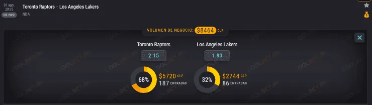 El OSO de Coolbet te cuenta que el favorito para ganar son Los Angeles Lakers, que pagan 1.80 veces lo que juegues, por sobre los 2.15 de los Toronto Raptors, si crees que serán los vencedores del partido.