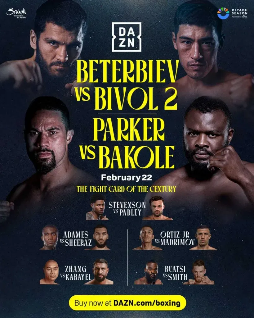 El evento de boxeo tiene lugar este sábado 22 de febrero a partir de las 13:00 horas de Chile en el Kingdom Arena de Riad, Arabia Saudita, sin embargo, el combate central entre Beterbiev y Bivol inicia aproximadamente a las 19:30 horas de Chile.