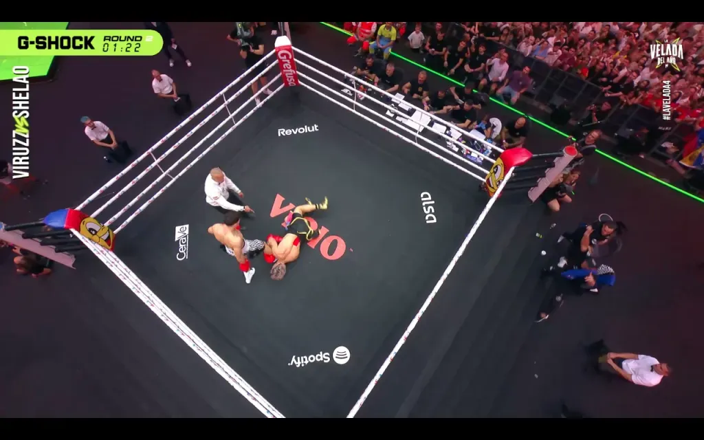 No obstante, el final fue avasallador. Viruzz mandó a la lona a Shelao, quien ya había sido conectado al principio del segundo round, pero que logró hacerse maña y abrazar a su oponente. Con su caída, pudo parar la pelea.