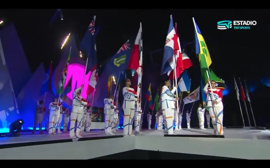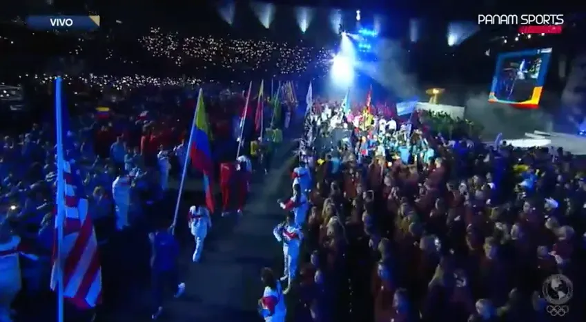 El escenario principal se llena con los abanderados de los países participantes de los Juegos Panamericanos.