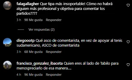 “¡Que tipa más insoportable! ¿Cómo no habrá alguien más profesional y objetiva para comentar los partidos?”, “¡Qué asco de comentarista! En vez de apoyar al tenis sudamericano”, “que horrible escucharte comentando un partido de tenis, en serio”.