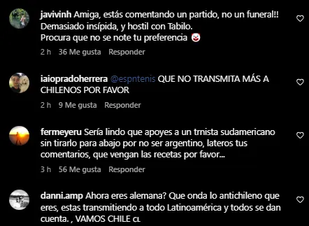 “Sería lindo que apoyes a un tenista sudamericano sin tirarlo para abajo por no ser argentino, lateros tus comentarios, que vengan las recetas por favor” y “¿ahora eres alemana? Qué onda lo antichilena que eres. Estás transmitiendo a todo Latinoamérica y todos se dan cuenta. Vamos Chile”, sentenciaron los hinchas.