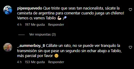 Otros comentarios fueron “cállate un rato, no se puede ver tranquilo la transmisión sin que pase un segundo sin echar abajo a Tabilo, más parcial por favor”, “ojalá Zverev te agradezca el apoyo”.