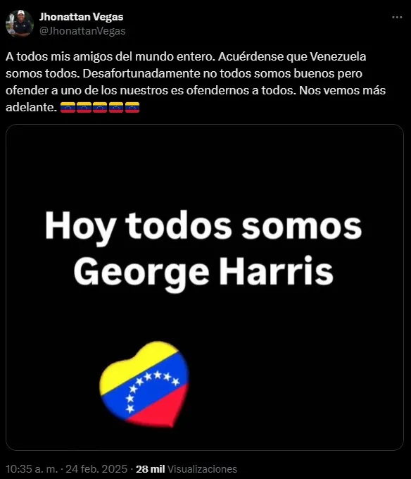 “A todos mis amigos del mundo entero. Acuérdense que Venezuela somos todos. Desafortunadamente, no todos somos buenos, pero ofender a uno de los nuestros es ofendernos a todos. Nos vemos más adelante”.