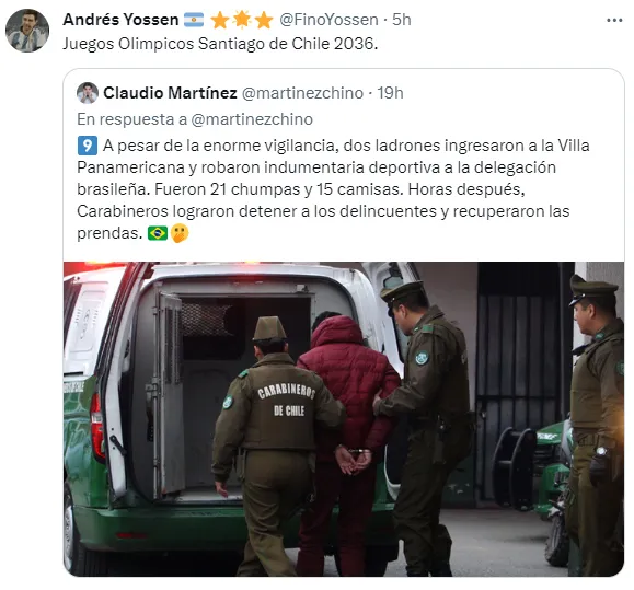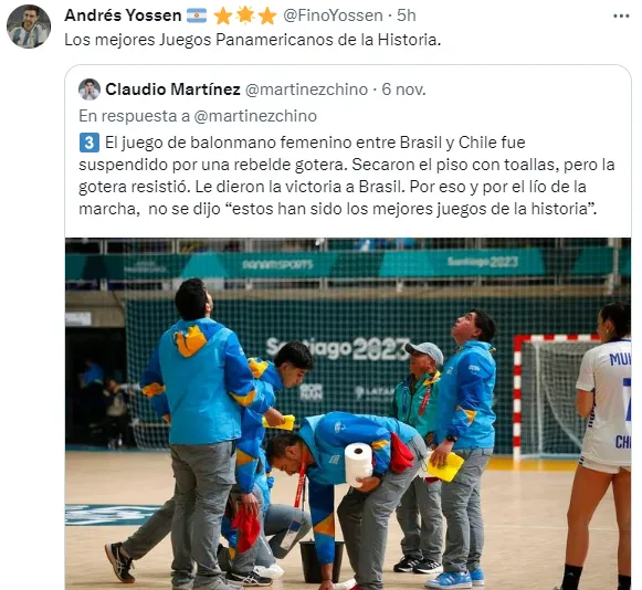 El periodista argentino, Andrés Yossen ha dedicado varias publicaciones en X chaqueteando los Juegos Panamericanos de Santiago 2023, alegando que incluso no le aprobaron su acreditación para cubrir el evento deportivo. Gonzalo Fouillioux salió a su camino.