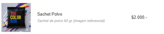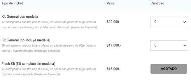 Las entradas incluyen el kit oficial con: morral, polera, sachet de polvos de colores y pulsera de acceso (Solo el Kit General incluye medalla). Pronto se informará sobre el punto de retiro.