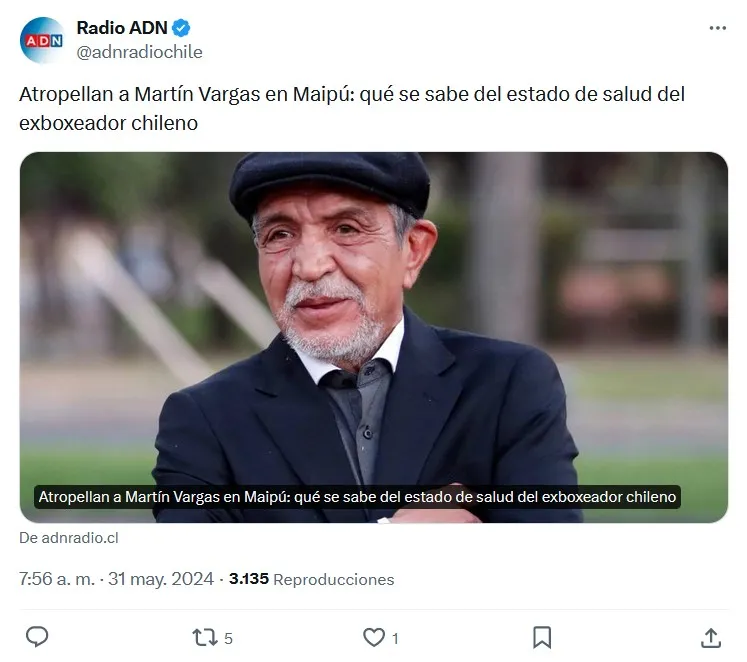 Extrema preocupación existe en el ámbito deportivo nacional, tras conocerse que el ex boxeador Martín Vargas sufrió un fuerte atropello por una motocicleta en las cercanías de su casa, en la comuna de Maipú, que lo tiene en un delicado estado de salud.
