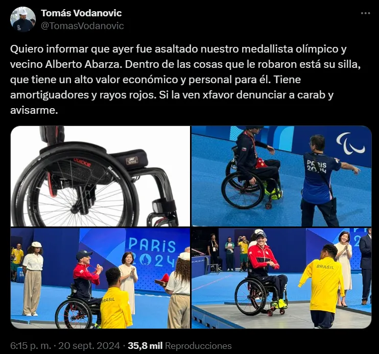 “Quiero informar que ayer fue asaltado nuestro medallista olímpico y vecino Alberto Abarza. Dentro de las cosas que le robaron está su silla, que tiene un alto valor económico y personal para él. Tiene amortiguadores y rayos rojos. Si la ven por favor denunciar a Carabineros y avisarme”, publicó Vodanovic.