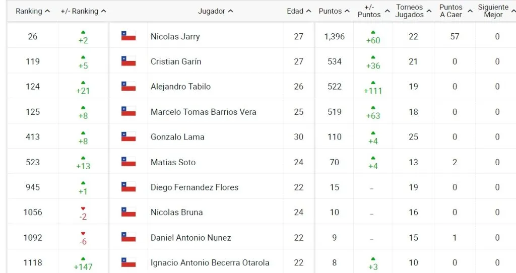 El logro más importante lo consiguió Nicolás Jarry, quien tras su tercera ronda en Londres, logró avanzar dos posiciones más, llegando al puesto 26, el mejor de su carrera. El espigado tenista nacional cada vez se mete más de lleno en el top 30 y las expectativas para la temporada sobre cemento en Estados Unidos son altas.
